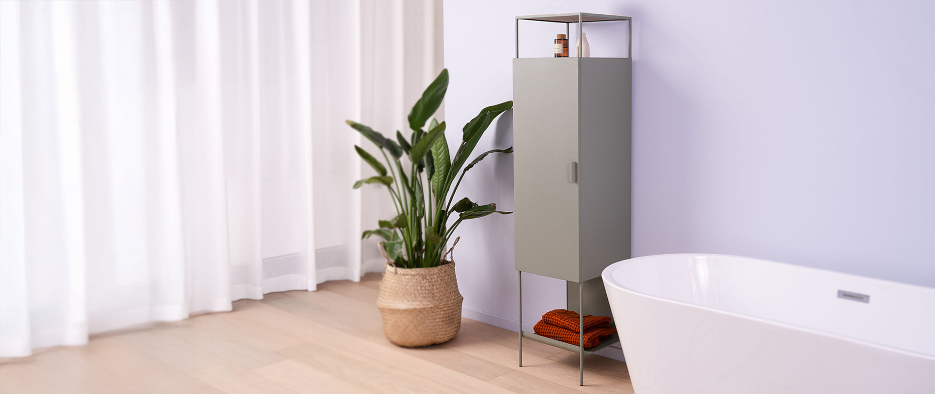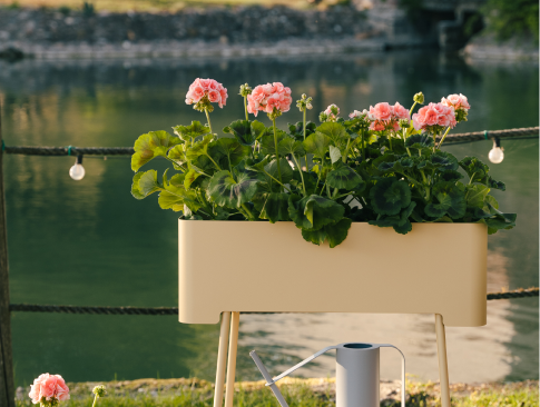 Il cestello in acciaio si interrompe e lascia spazio allo scheletro, minimale, che si fa maniglia per favorire il trasporto e pratico aggancio per gli ombrelli pieghevoli