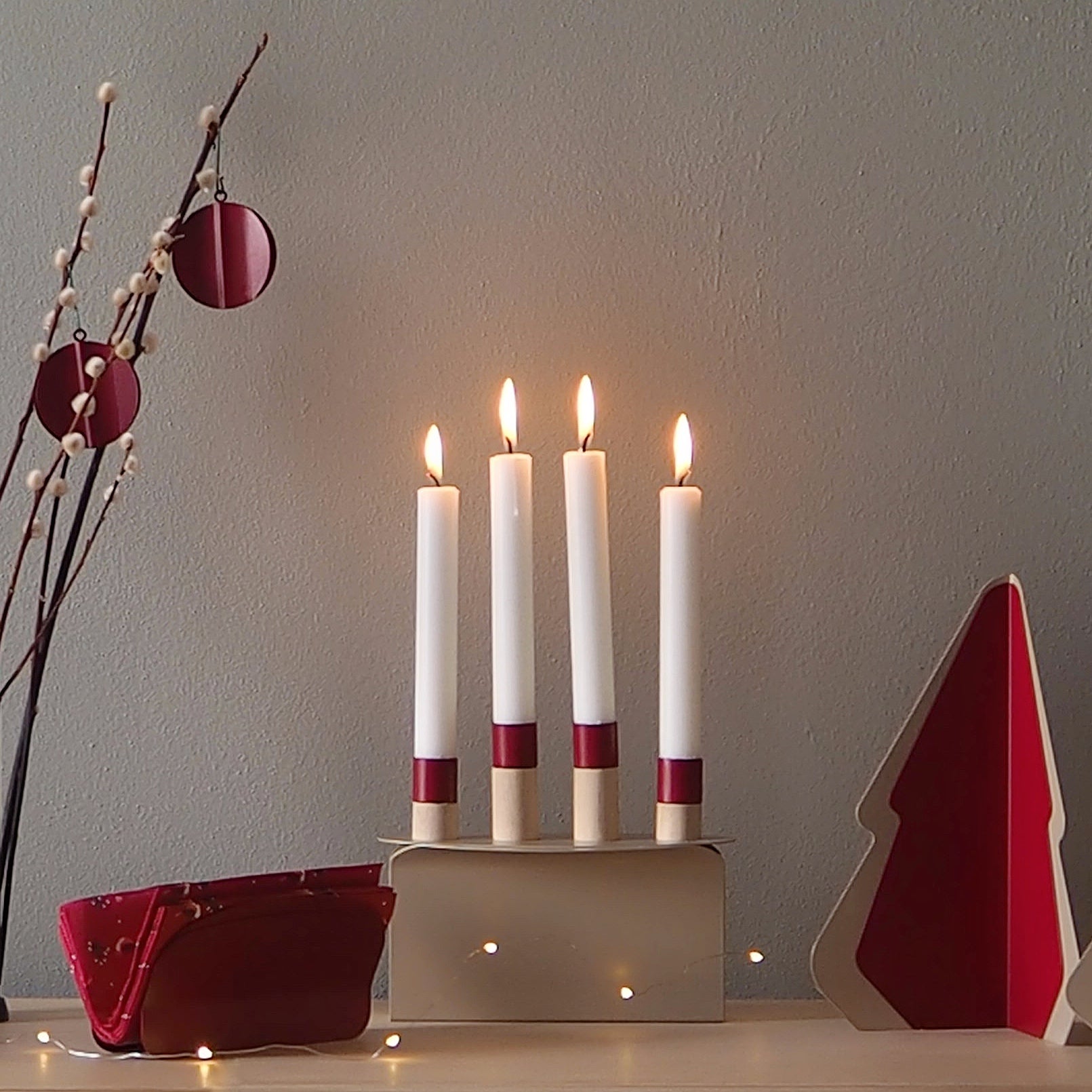 Dieser dekorative Kandelaber verfügt über vier Kerzen auf unterschiedlichen Ebenen. Auf den ersten Blick fällt die leichte Krümmung des Metalls auf, die, von der Seite betrachtet, die hölzernen Zylinder aufnimmt, in denen die Kerzen sitzen.
