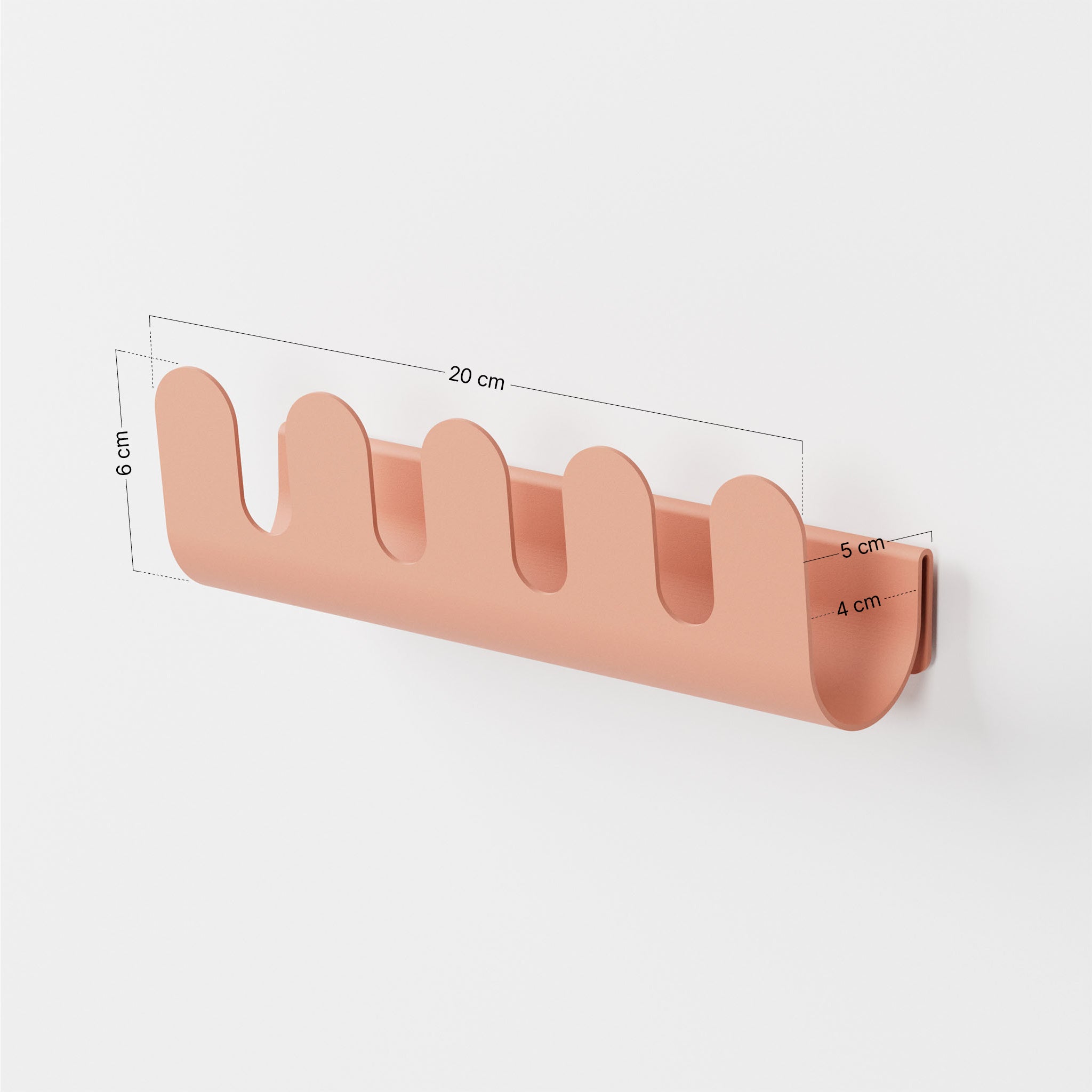 Der gebogene Teil zum Aufhängen der Bademäntel ist bei beiden Varianten 4 cm tief und 20 cm breit. Die maximale Höhe der Duschkabinenvariante beträgt 30 cm, die maximale Tiefe inklusive der oberen Haken 9 cm. Die Hakenbreite beträgt 4 cm. Die maximale Höhe der Wandvariante beträgt 6 cm, die maximale Tiefe 5 cm. Beide Varianten verfügen über fünf Haken mit je 2,7 cm Breite und einem Abstand von 1,7 cm. Maximale Belastung: 5 kg, gleichmäßig verteilt.
