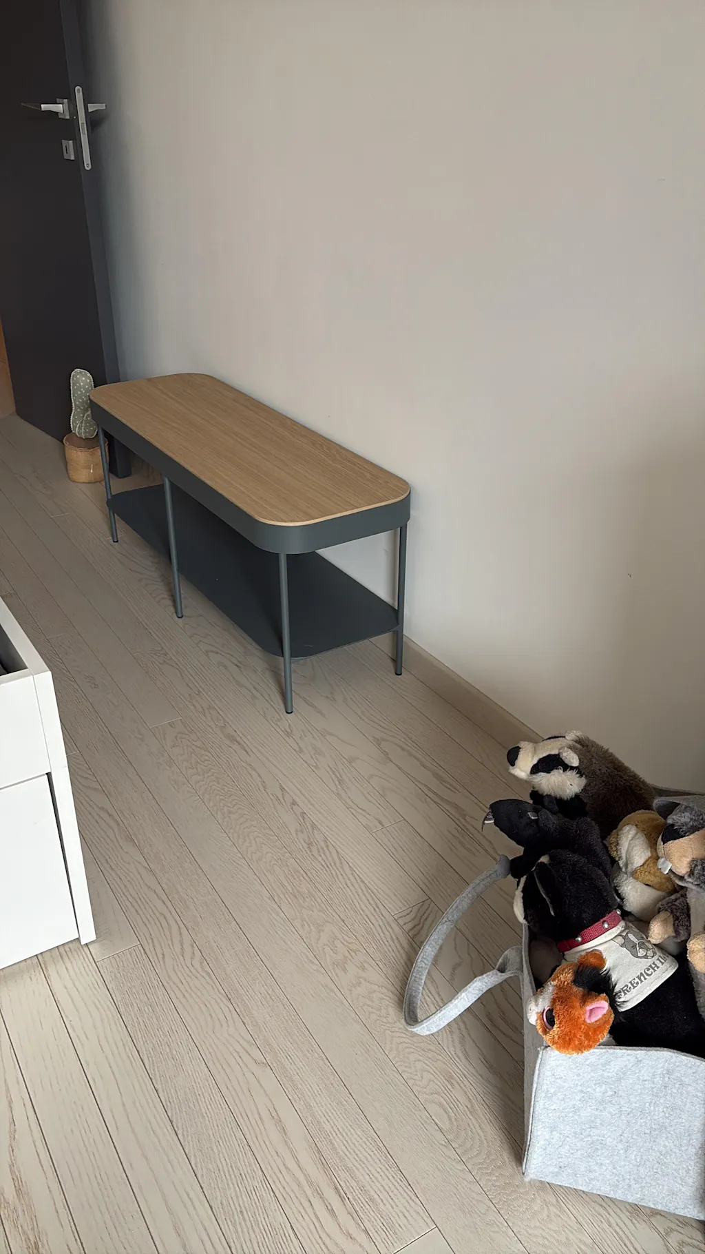 Ein Ort zum Verweilen und Entspannen. Zwischen dem Lärm draußen und den Hausarbeiten. Ein Moment nur für Sie. Diese Eingangsbank ist zum Sitzen und Warten gedacht, zum Ausziehen und Verstauen der Schuhe in einem einfachen, offenen Fach.