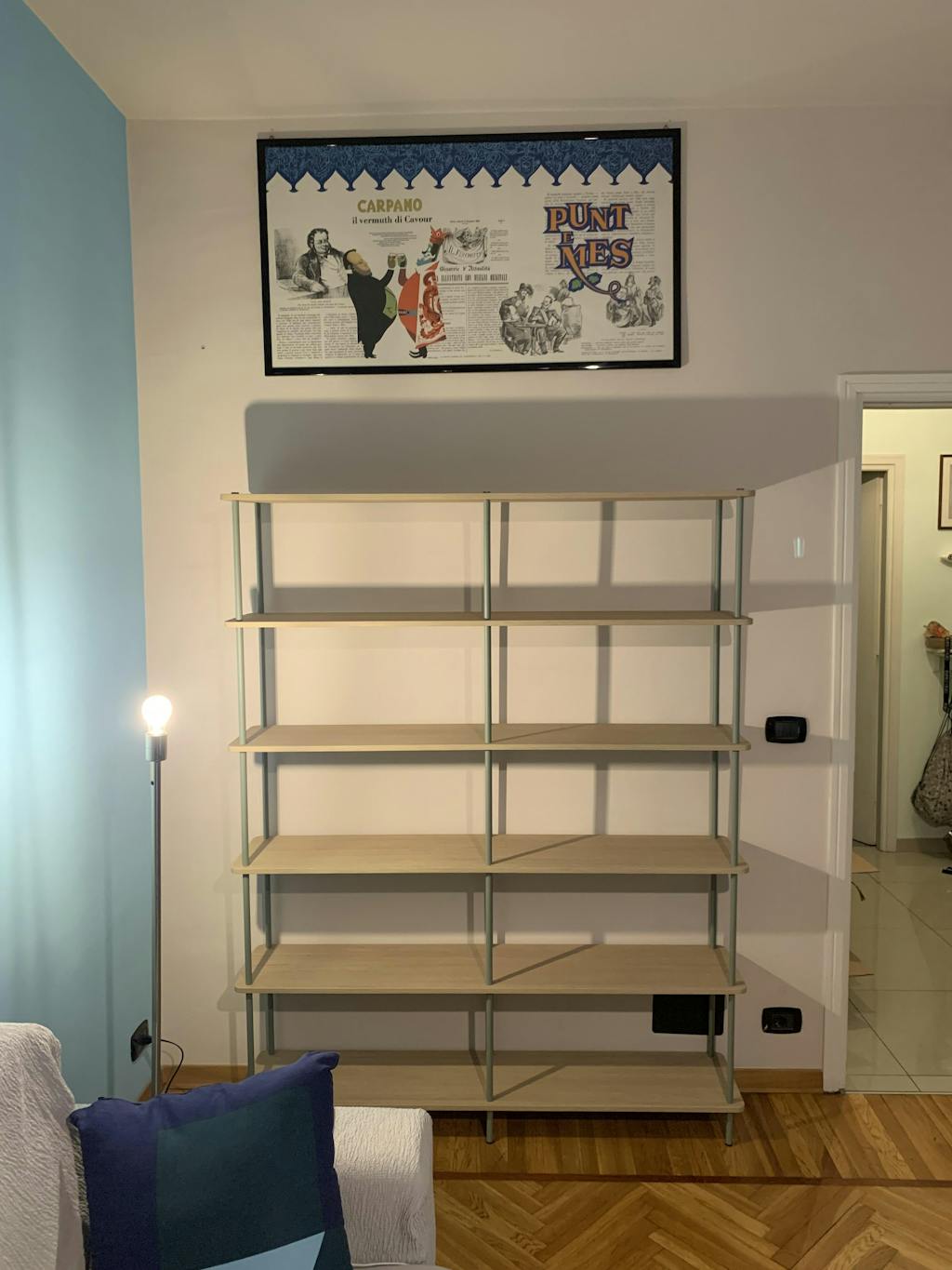 Regal-, Bücherregal- und Aufbewahrungssystem. Lackierter Stahlrohrrahmen und Regalböden aus Recyclingholz mit natürlichem Eichenfurnier.