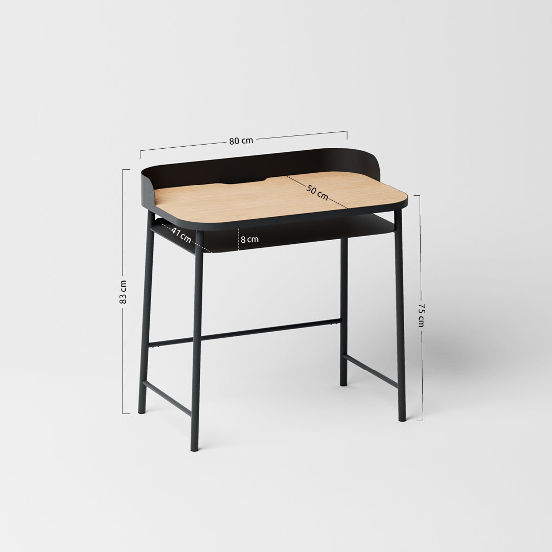 Der Schreibtisch besteht aus lackiertem Stahl mit einer Holzplatte aus Eichenfurnier.