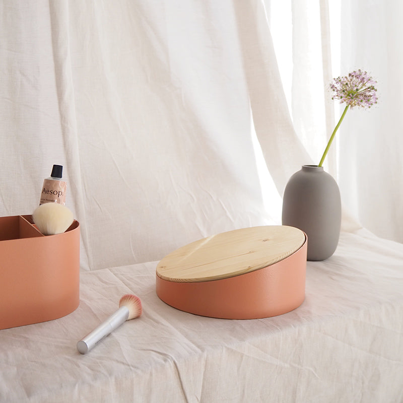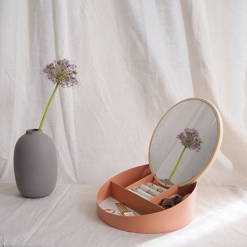 Made of painted steel and internally lined with fabric, this cylindrical jewelry box is closed by a lid that shows natural wood on one side and mirrored sheet metal on the other: choose which side to show whenever you want, the one that represents you.
