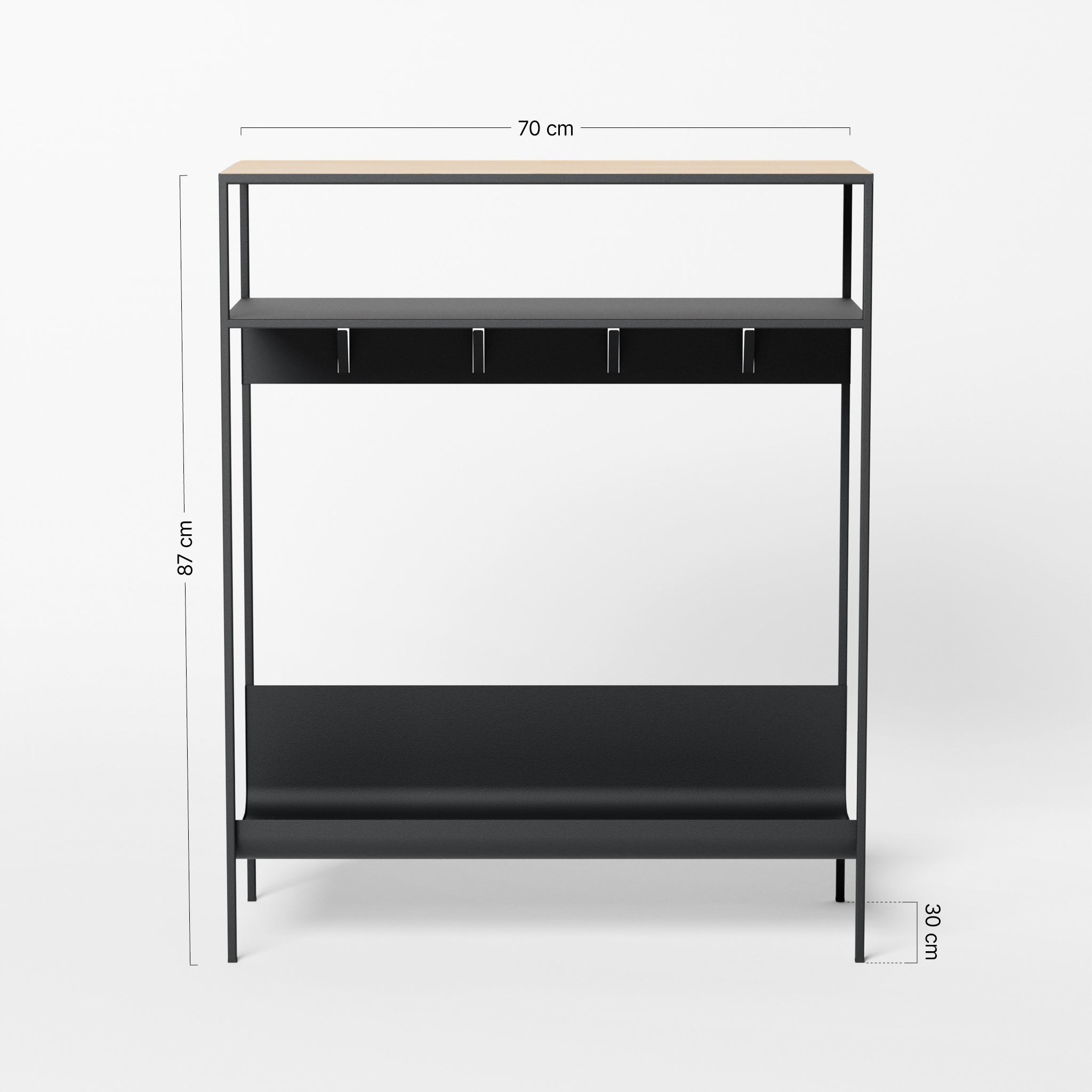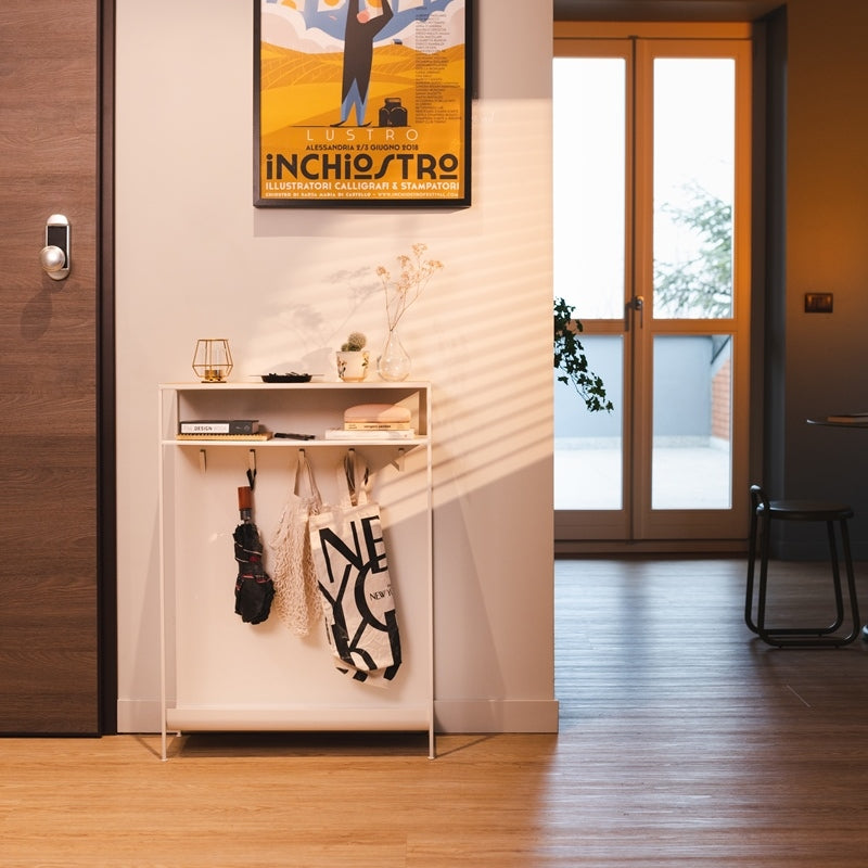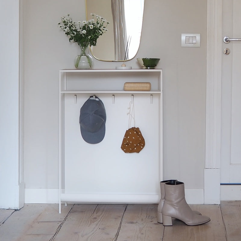 Created to add style to any room, practical for a hallway, a corridor or an entrance. The console table responds to aesthetic needs, perfect for holding ornaments and plants, but also practical, suitable as a pocket emptier to always have bunches of keys and wallets within reach. The hooks under the shelves can be used to hang handbags and accessories.