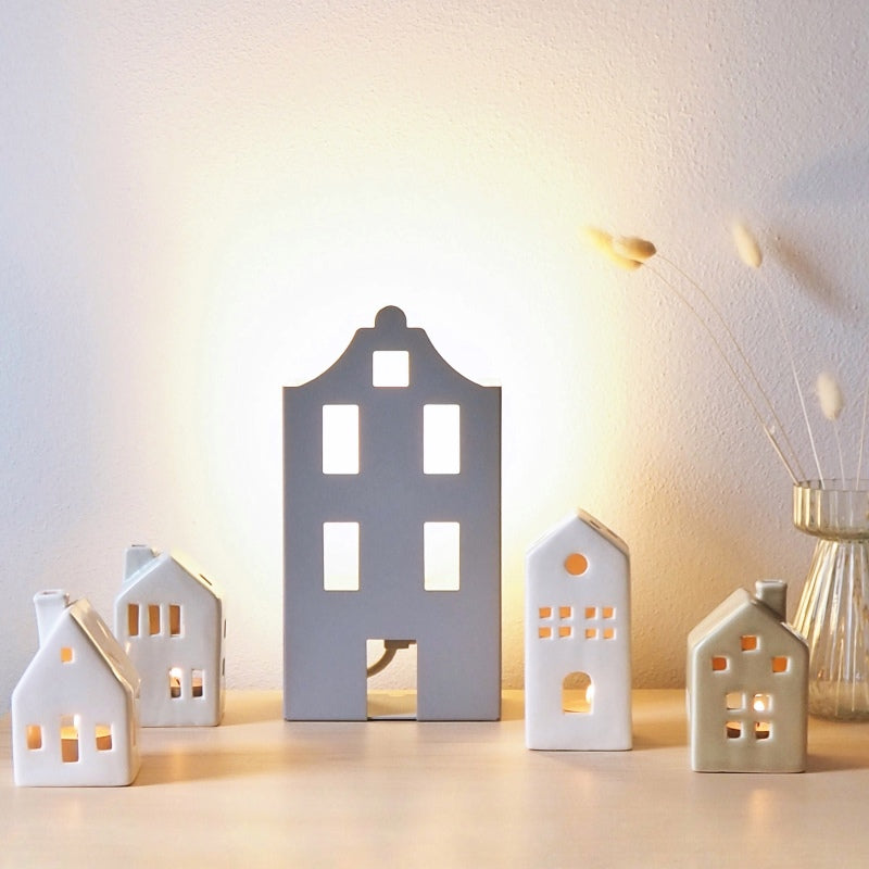 The inspiration is the traditional ceramic houses in use in Holland, where today electricity takes the place of the candle and steel that of the ceramic. A "playful" but elegant object at the same time.