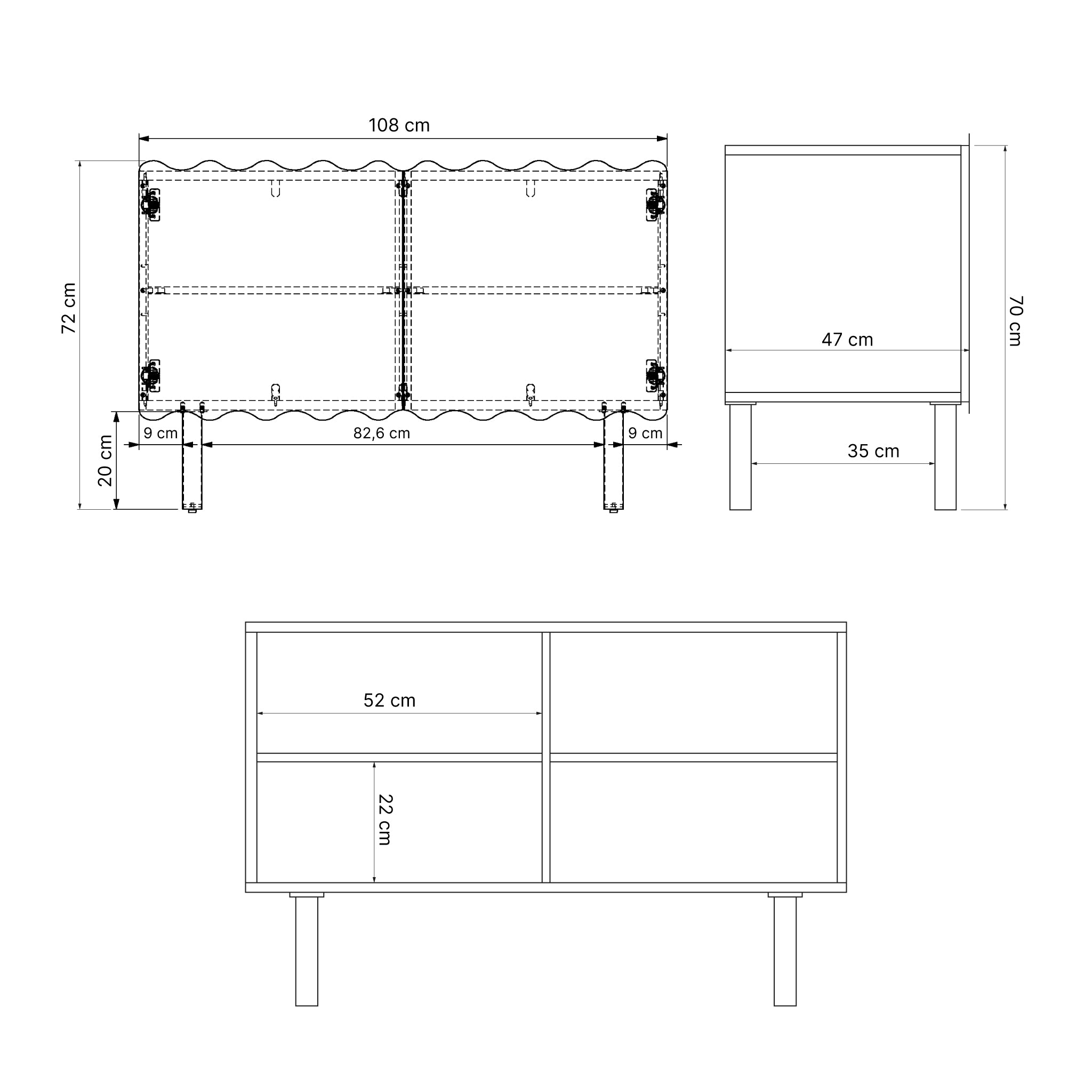 With a wooden frame and painted metal front cladding, this piece of furniture is available in four different versions: three-door sideboard, also a TV cabinet, two-door buffet, sideboard and vertical column.