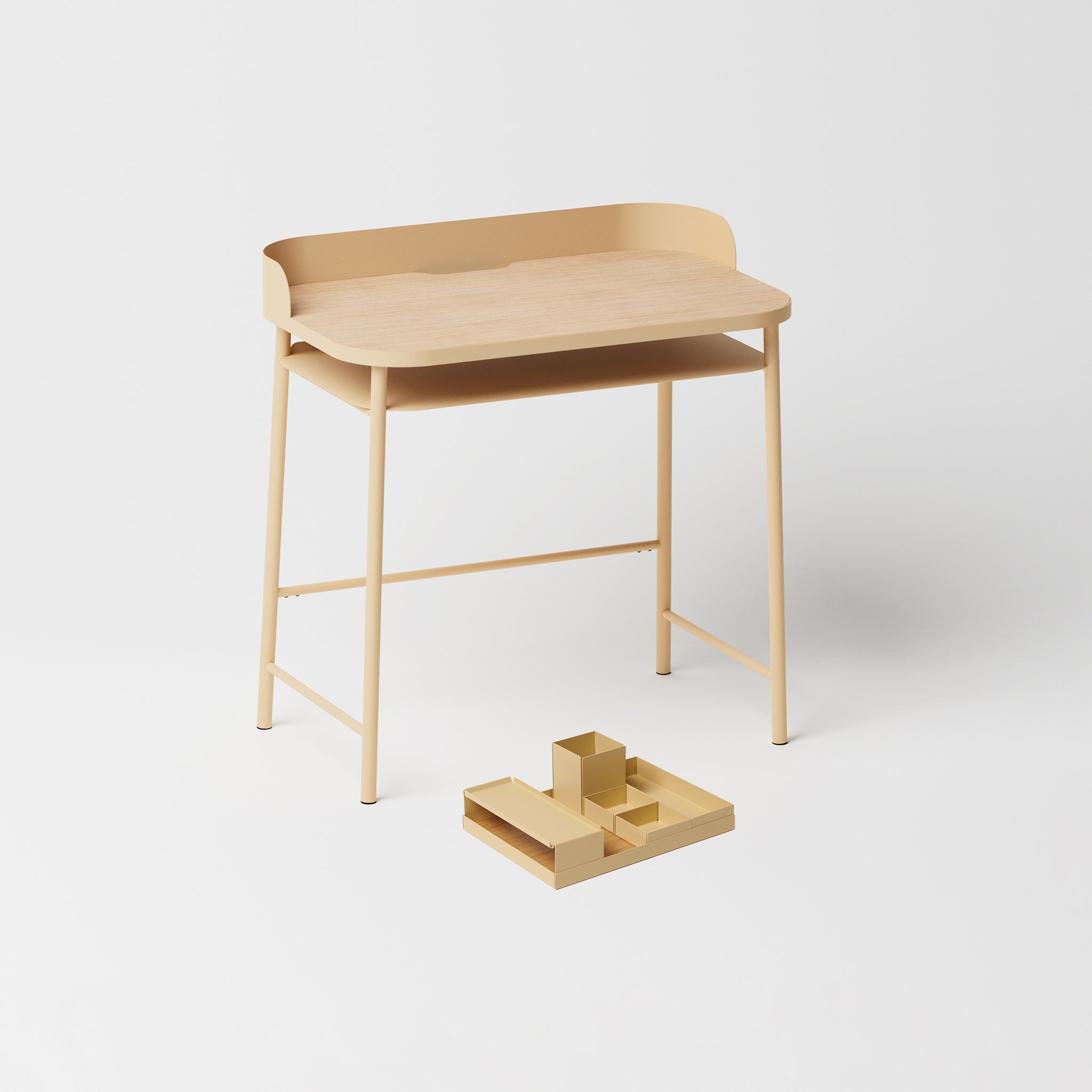 Where do you put your colored markers, your favorite pens, paper clips, pins, erasers and pencils? Designed to geometrically organize your desk life, this organizer is modular and disassemblable at your pleasure. Use pen holders and boxes separately or group them on the steel tray. With recycled wood top, natural oak veneer. Essentiality, geometry, aesthetics.