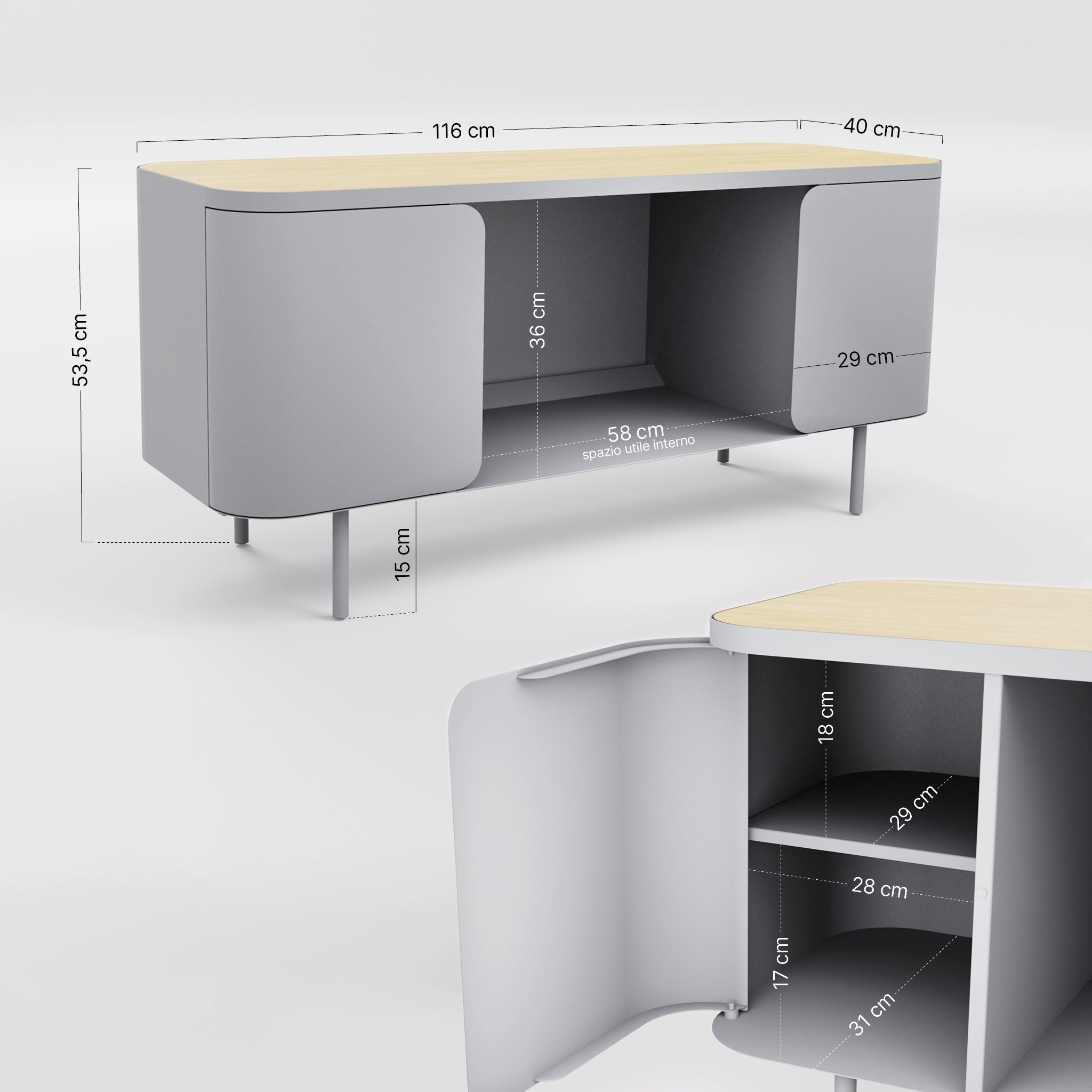 The cabinet consists of a central body to be understood as a free support compartment. On both sides, opening doors give access to other spacious compartments. The upper shelf of the cabinet is in oak finish veneered wood.