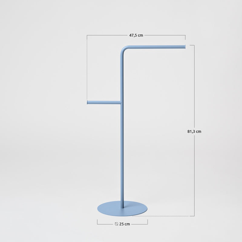 The height is 81 cm, the maximum width is 47.5 cm, the maximum depth is 47.5 cm. The diameter of the base is 25 cm, the height of the roll holder arm from the ground is 53.5 cm. The longest arm measures approximately 29.4 cm, the roll holder arm measures approximately 16.5 cm.