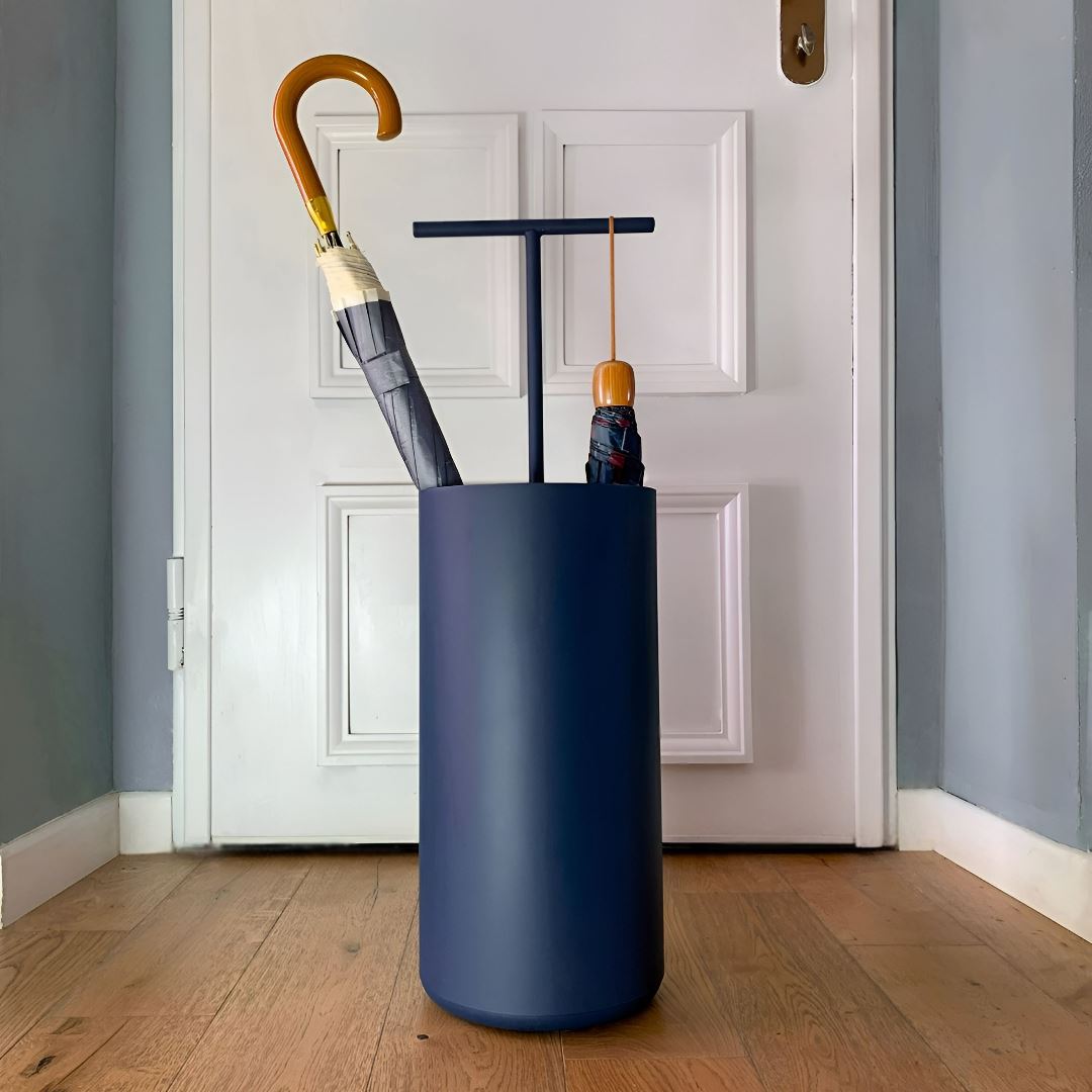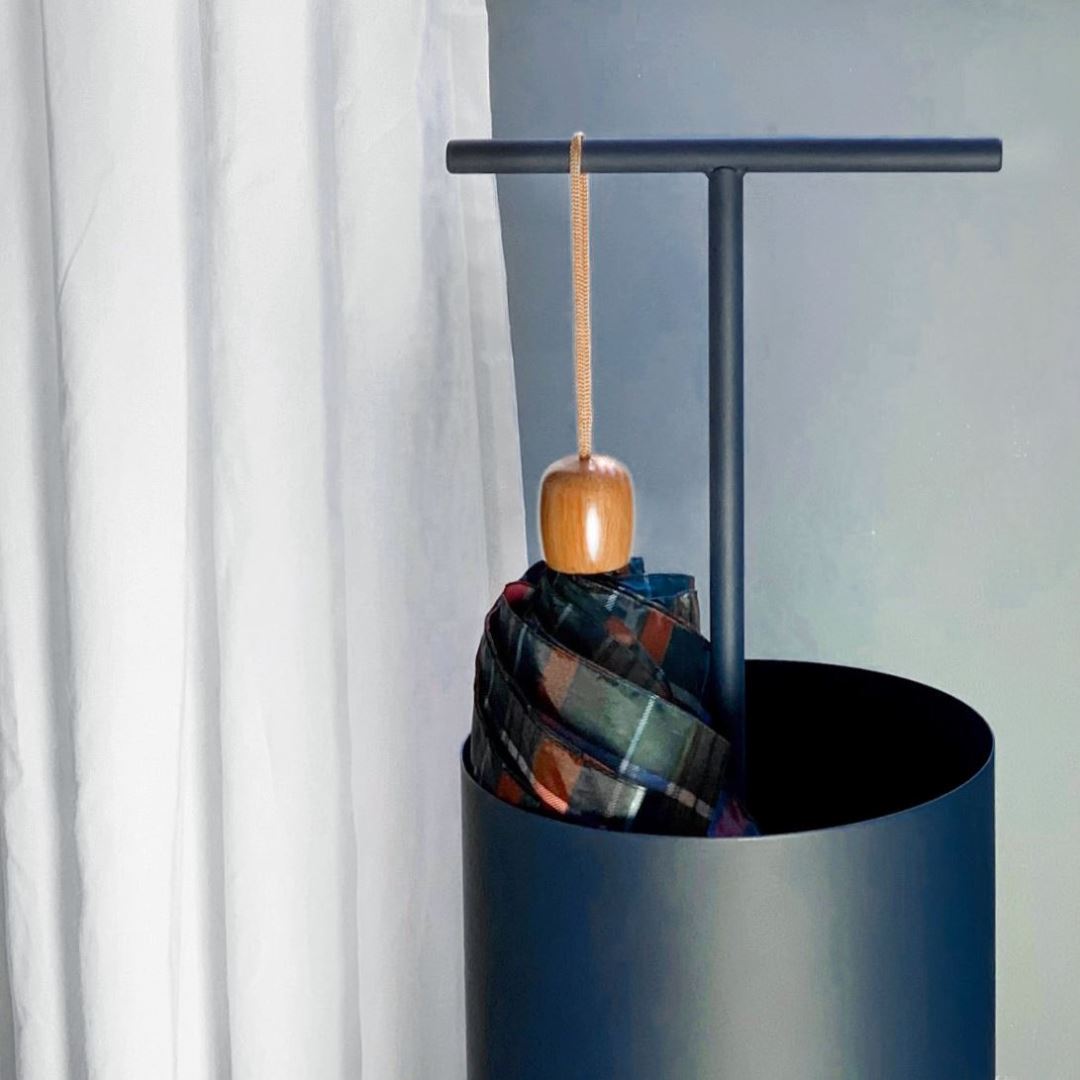 The steel basket is interrupted and leaves room for the minimal skeleton, which becomes a handle to facilitate transport and a practical attachment for folding umbrellas.