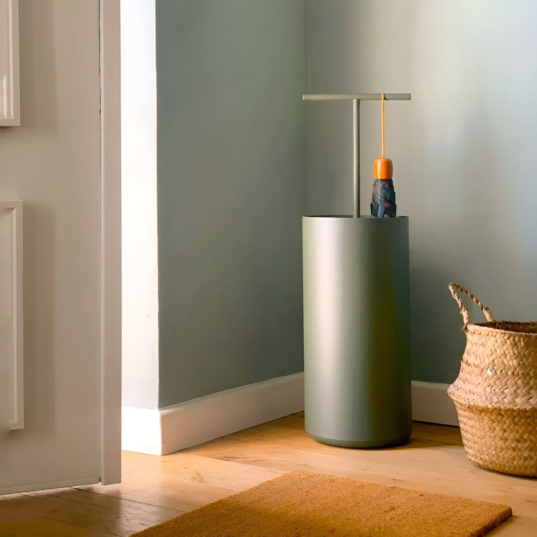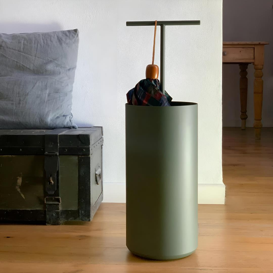 The steel basket is interrupted and leaves room for the minimal skeleton, which becomes a handle to facilitate transport and a practical attachment for folding umbrellas.