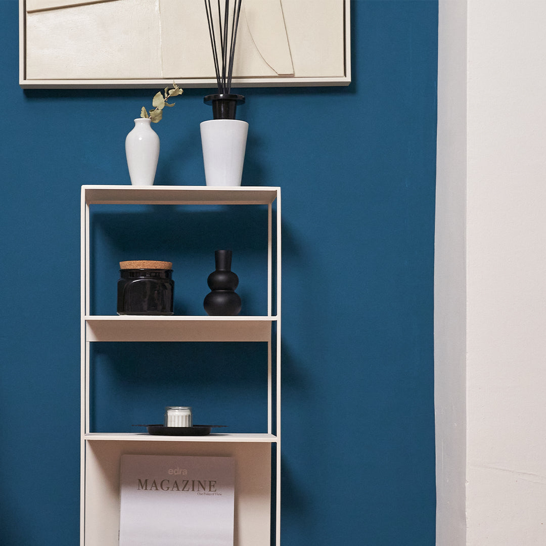 A steel cabinet with four shelves to better organize your bathroom. Light profiles support the supports, a hinted curvature on the second shelf accompanies the gaze to the ground, where the wave of the lowest shelf refines the shapes.