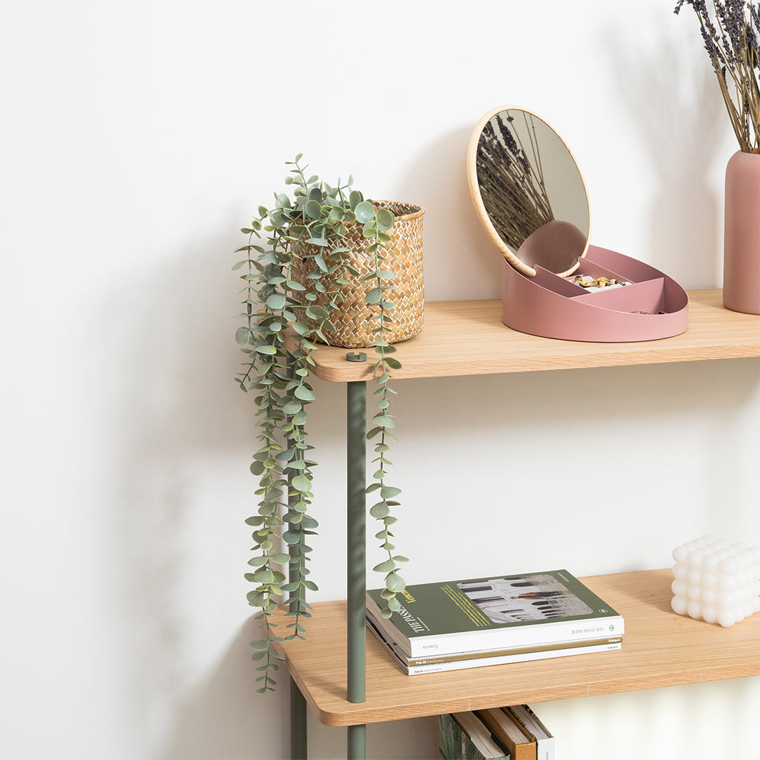 The structure is made of powder-coated steel, the shelves are oak veneer.