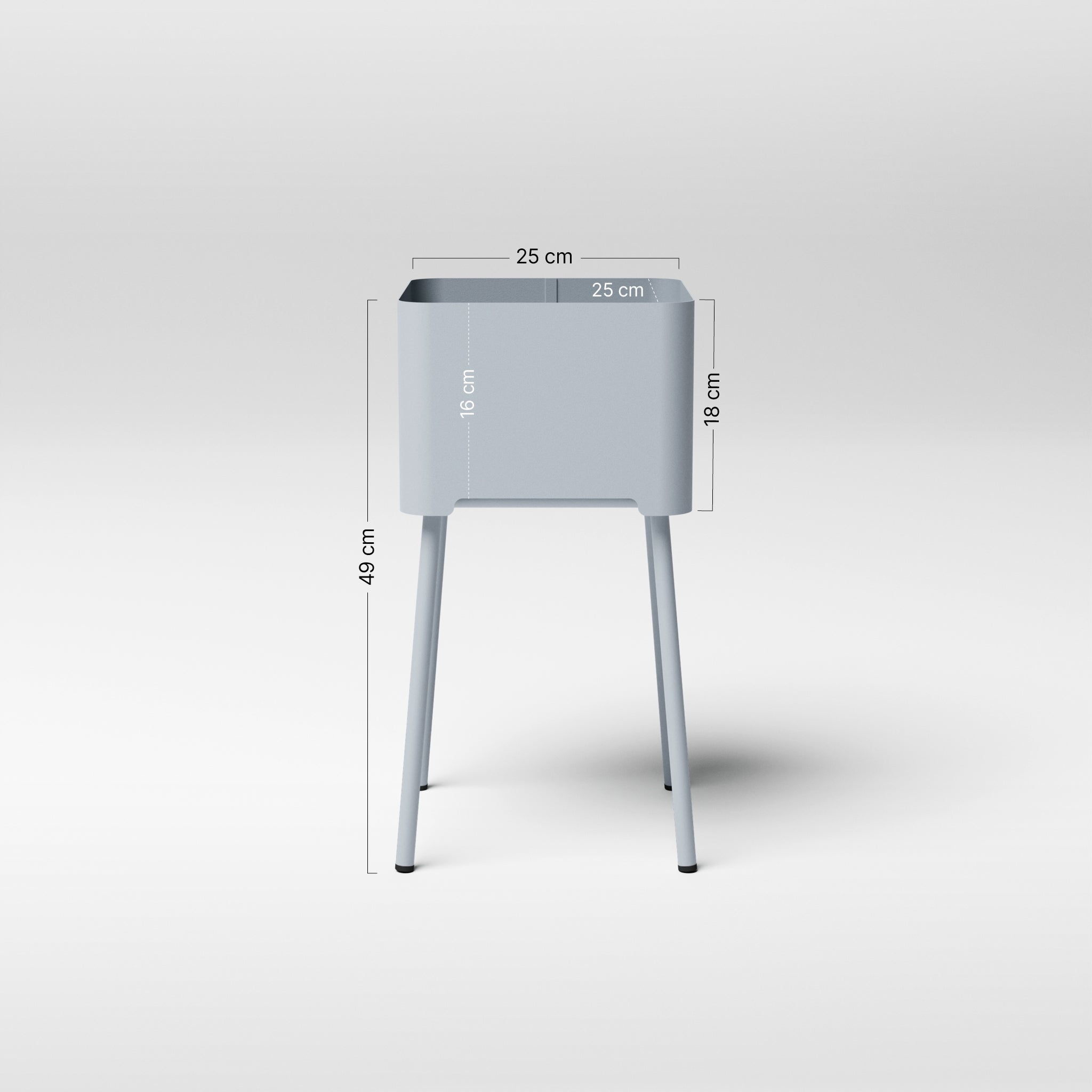 Freestand plant stand in painted steel and treated for outdoor use with tray in recycled wood faced with natural oak.