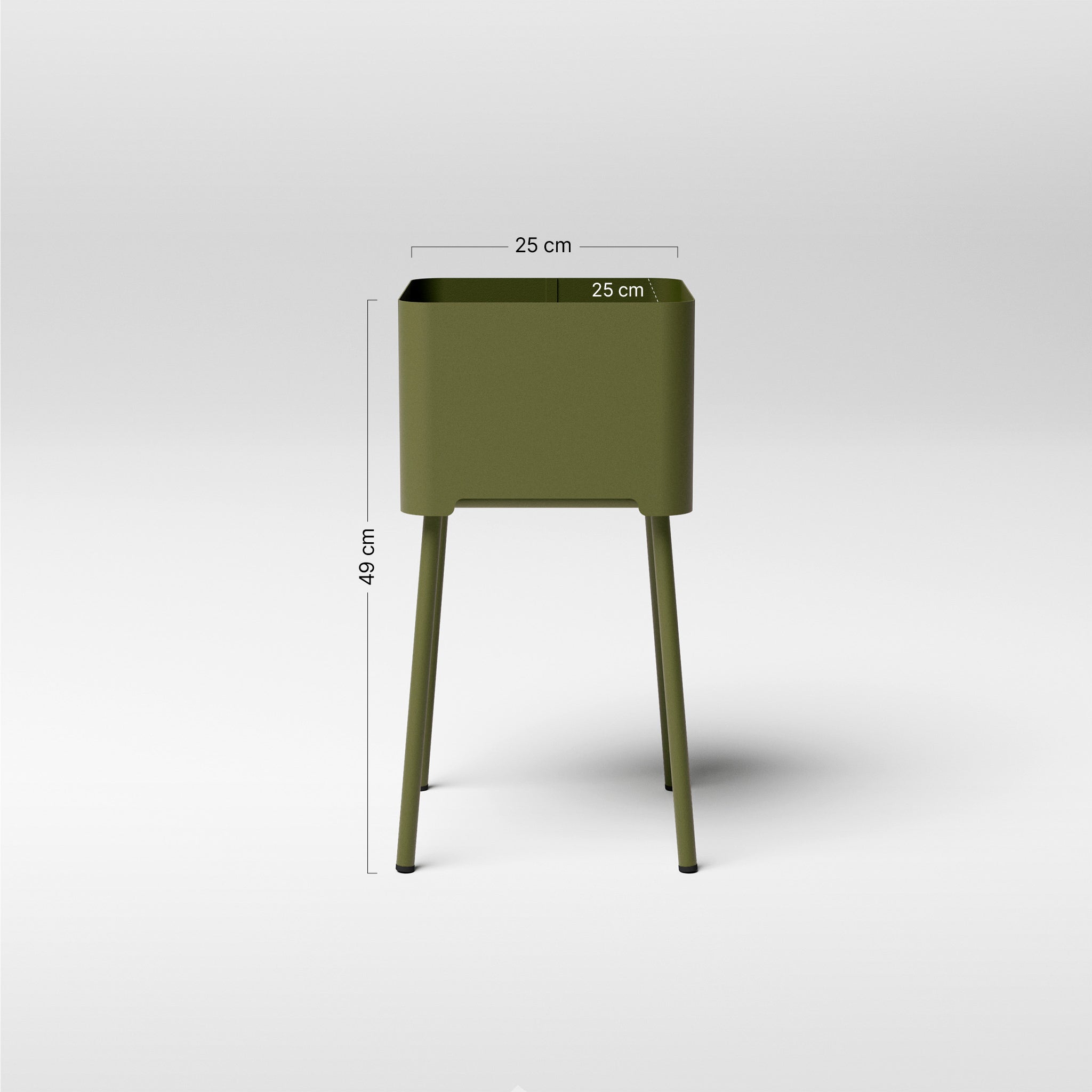 The maximum height is 49 cm. The planter box has a width and depth of 25 cm (small version) or 40 cm (big version). The internal height is 16 cm, so if you don't want the pots to protrude from the top, use pots with a maximum height of this measurement.