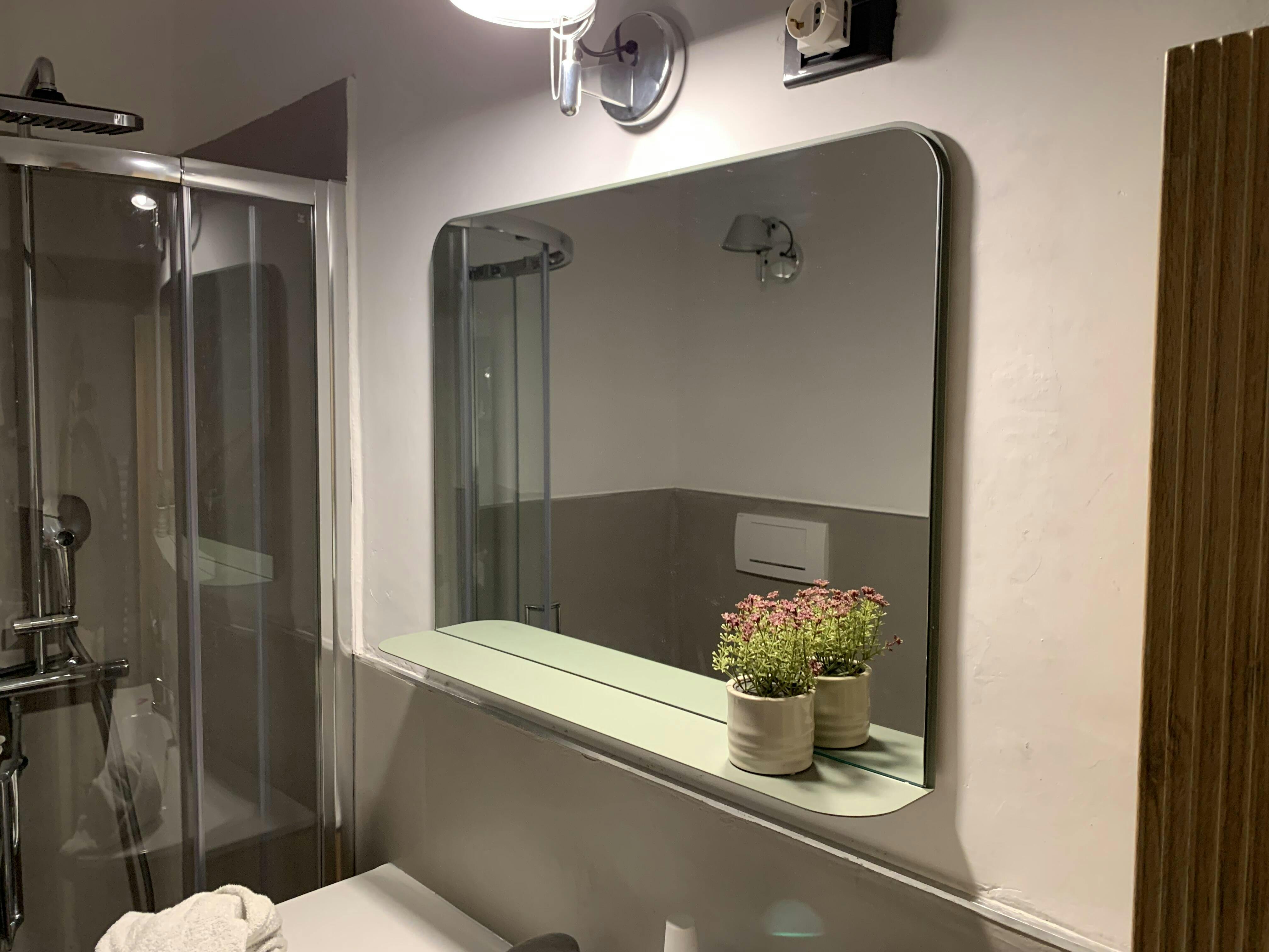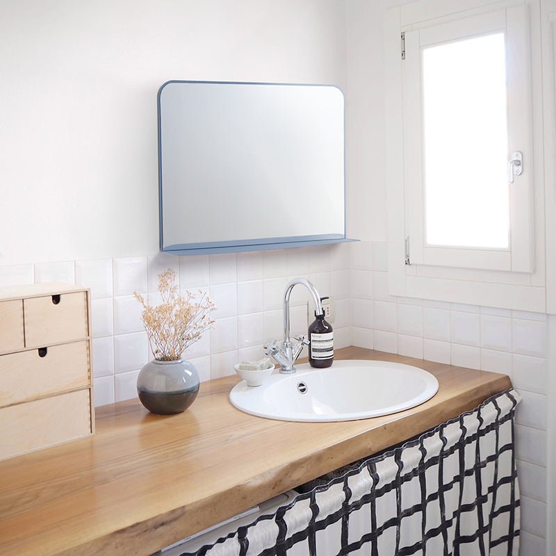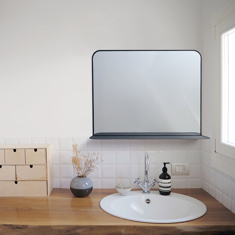 A thin steel frame crowns the reflective surface, giving a touch of discreet but decisive colour. A practical integrated shelf offers support for keys and a mobile phone, if you use it in the hall, or brushes and bottles, if you use it in the bathroom, but also (why not?) small decorative plants.