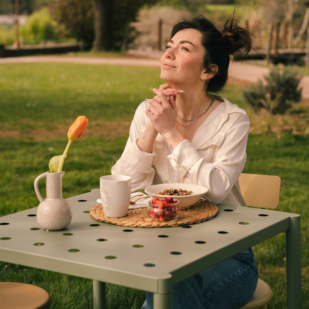 Imagine a terrace overlooking the lake. Imagine a sunset, the sun in your face, the long shadows of the evening. Wherever you are, a space opens up to your eyes, all for you. This coffee table with a perforated surface (which helps water dripping) is designed for your outdoor breakfasts and candlelit dinners.