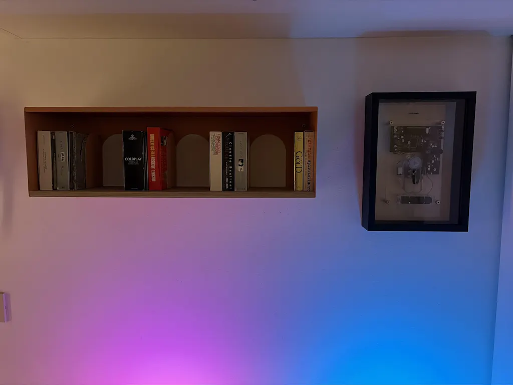 A través de tu salón, como en un cuadro. Tu biblioteca personal, tus colecciones expuestas en un espacio que incorpora el color de tus paredes. Metafísico.