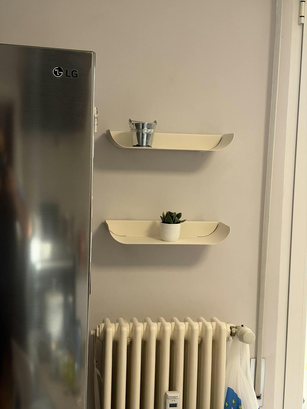 Ispirata al letto di un fiume, l'alveo, disegna curve fluide e avvolgenti. Un'estetica minimalista per queste mensole, leggere ma solide, che celebrano il vuoto e l’equilibrio.