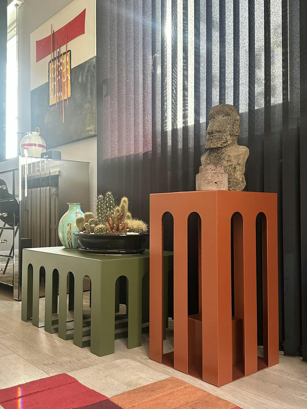 L'architettura italiana rinascimentale e antica, nel tuo salotto. Uno scorcio moderno e minimale. Una struttura che cela al suo interno un secondo elemento: il vuoto nel caso del coffee table, luogo di incontro ben definito dalle fasce orizzontali e il pieno nel caso del side table, luogo di arrivo e di rifugio (vedi anche il side table Tiziano). Entrambi sono visibili attraverso le arcate, suscitando la curiosità di chi osserva. Per il tuo salotto, al centro di un tappeto o nel tuo angolo preferito.