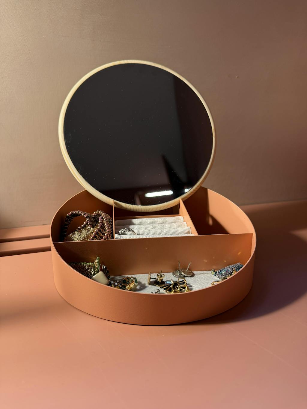 Come un segreto, appoggiato nel tuo angolo preferito, che ti rivela. Togli il coperchio, si apre il tuo mondo di preziosi, appoggia lo specchio e osserva la bellezza. Quattro scompartimenti per gioielli, collane e orecchini, più uno riservato agli anelli.