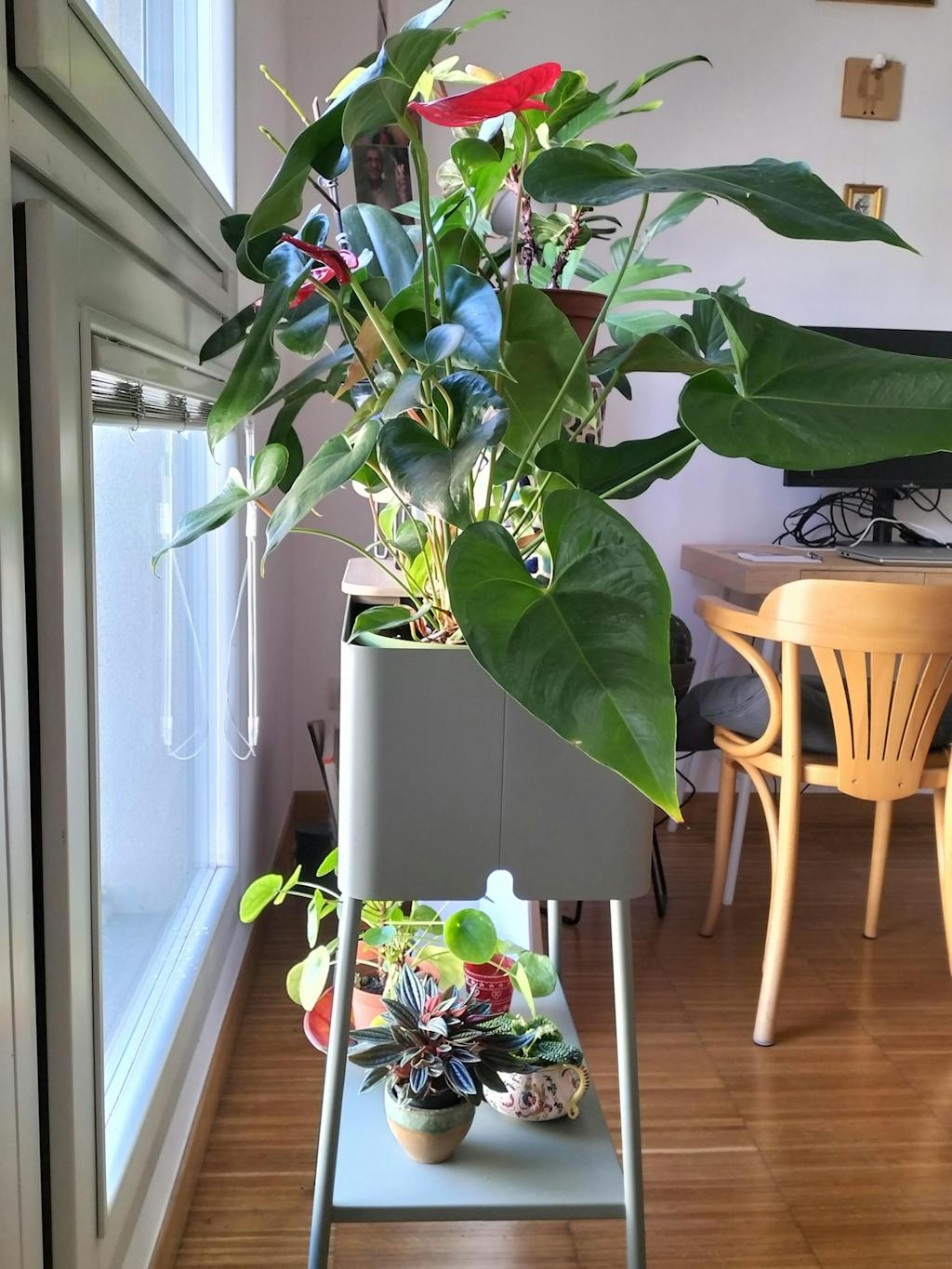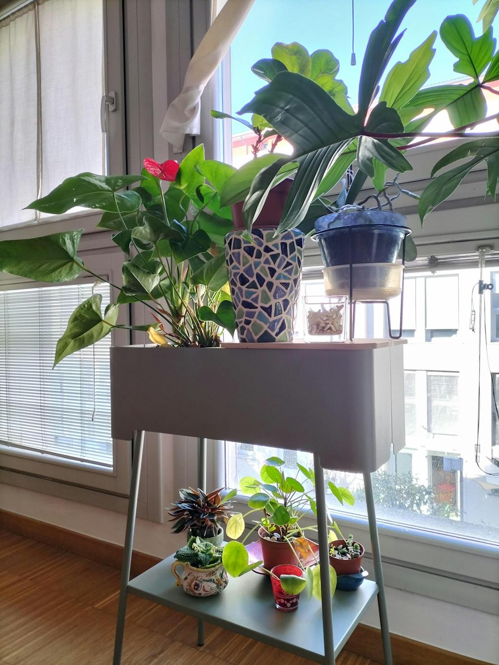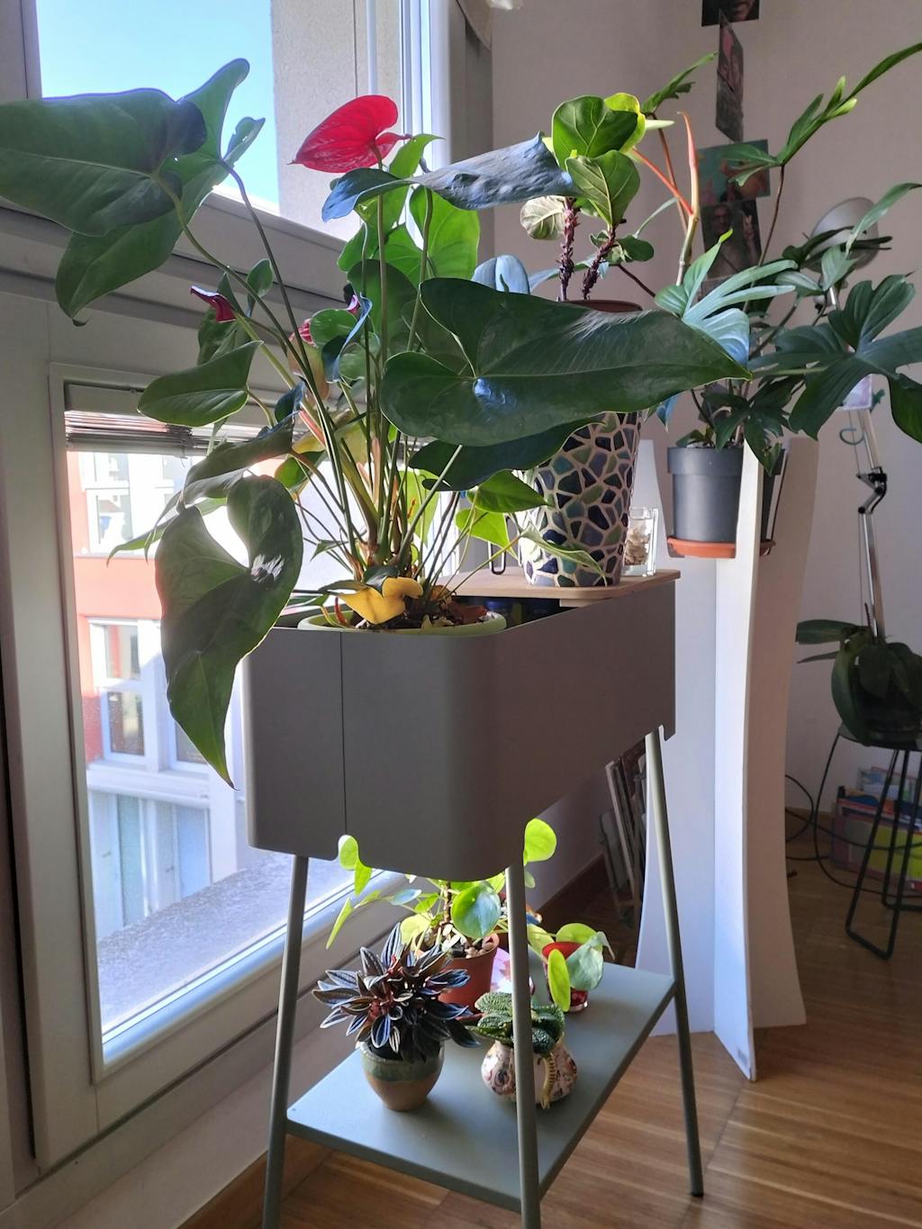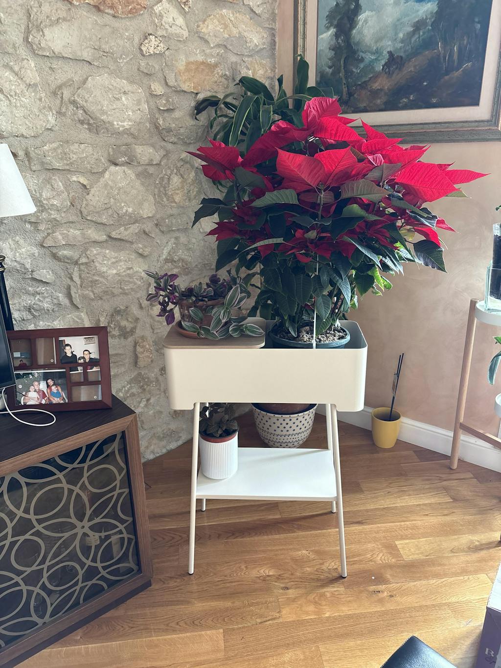 In questa versione con sostegno alto, il portavasi diventa vero e proprio protagonista, in interni come in esterni. Pratica e versatile anche grazie al ripiano centrale.