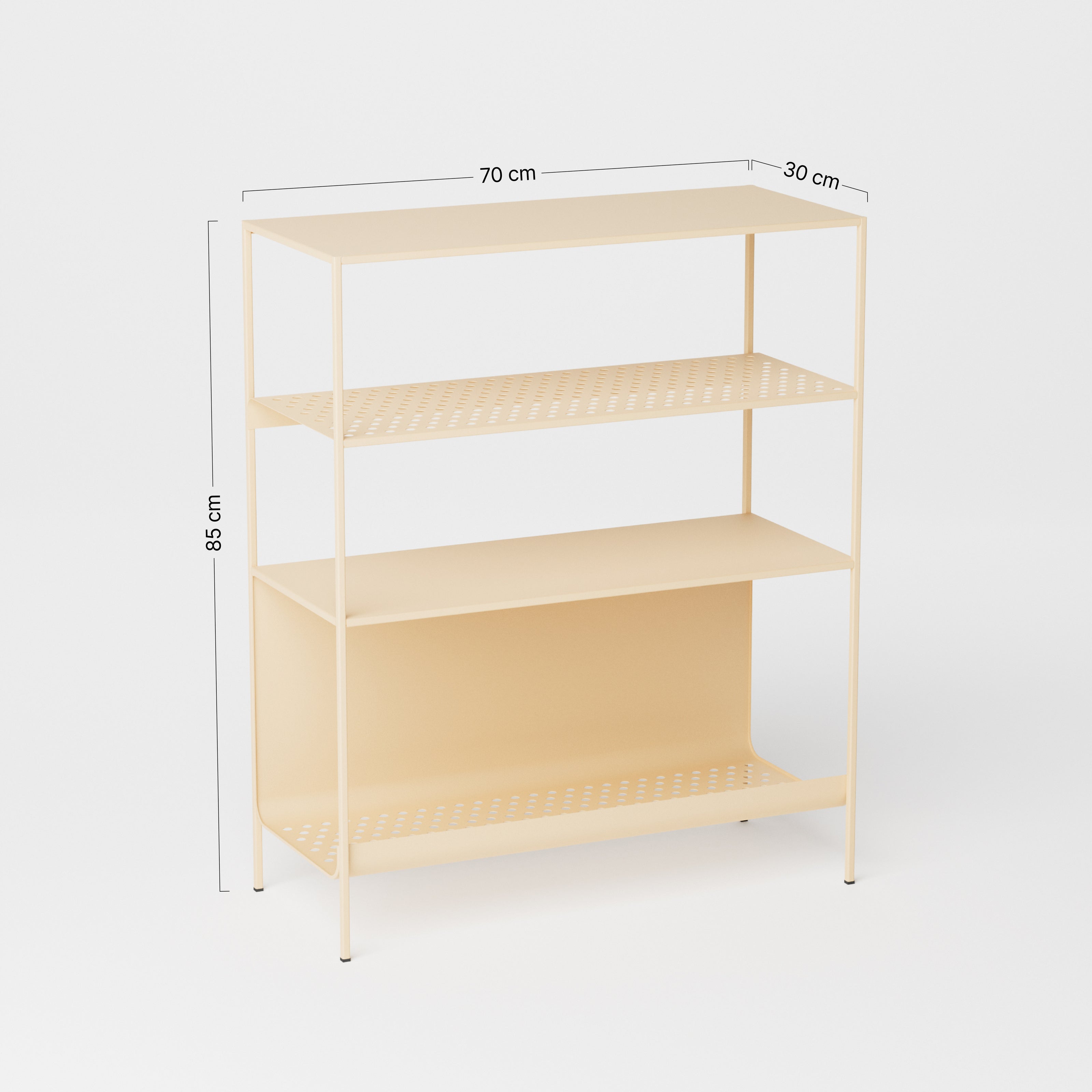 Uno scaffalino in acciaio con quattro ripiani per organizzare al meglio i tuoi spazi esterni. Visivamente leggero, una curvatura accennata sul secondo ripiano accompagna lo sguardo fino a terra, dove l’onda rifinisce le forme e si riverbera, negli accenni sinuosi delle mensole.