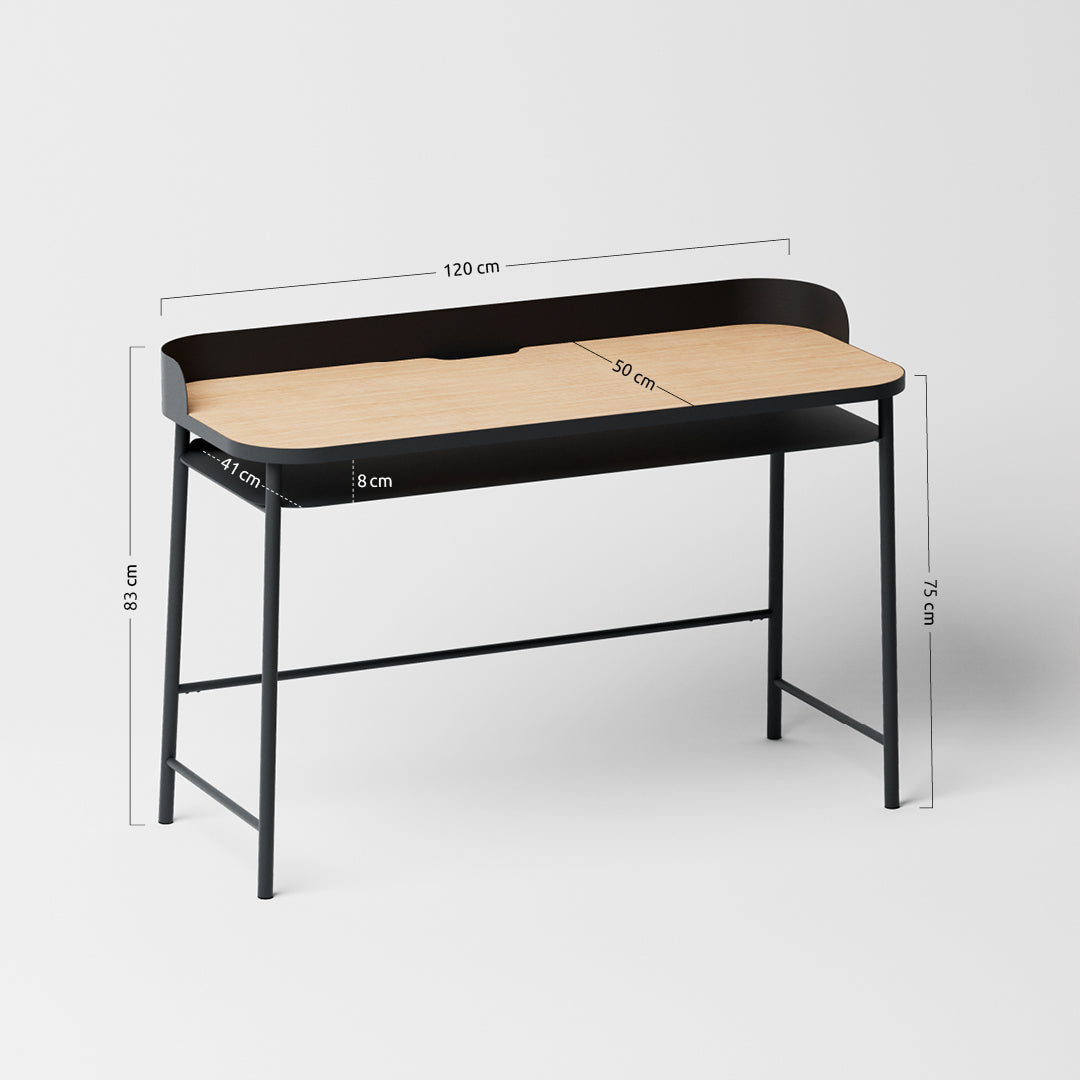 La scrivania è costituito da una struttura in metallo e da un piano di legno con uno spazio passacavi. Sotto il piano è presente una mensolina da utilizzare come piano di appoggio per documenti o per riporre un laptop.